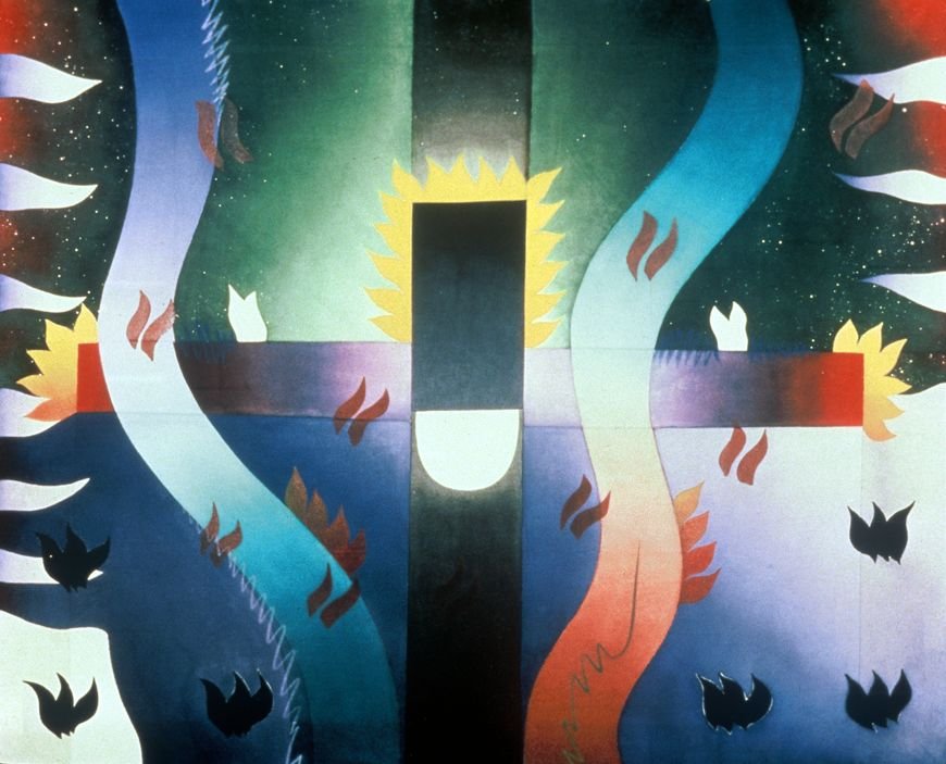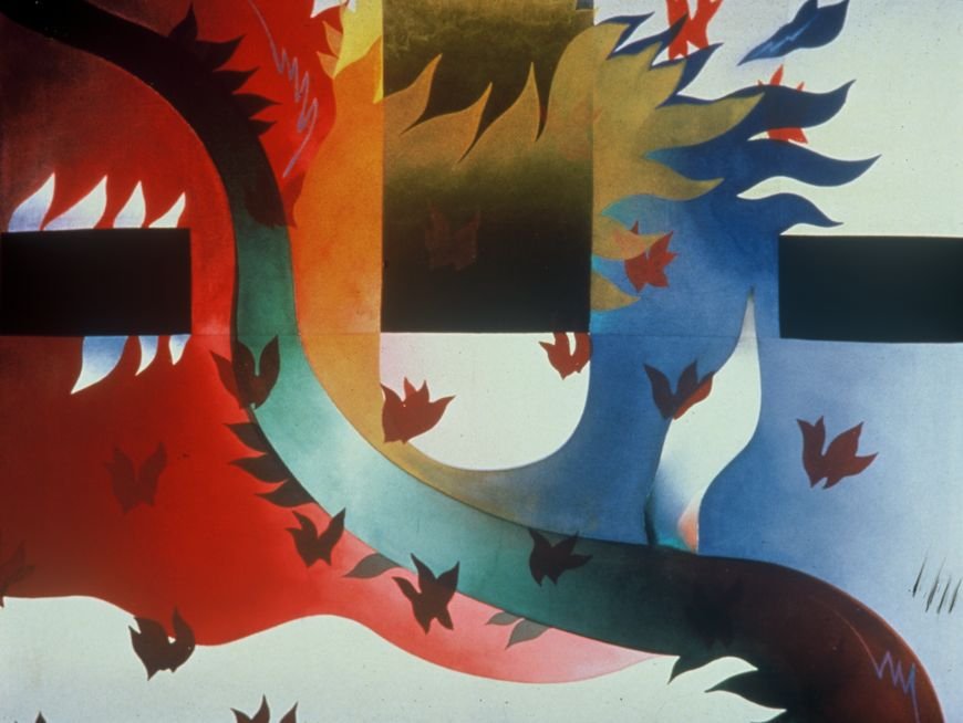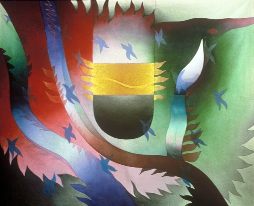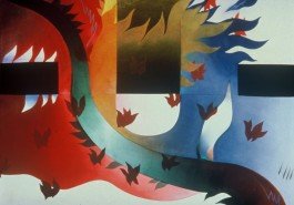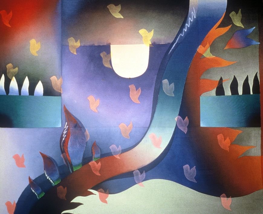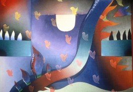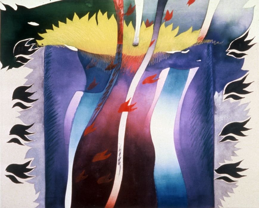 Foot Prince / The Path, 56″ x 68″, 1981The Foot Prince Series: These are the first of three series painted on stretched canvas, then taken off the stretchers and hemmed into tapestries. The title “Foot Prince” evokes the vision of a royal prince, having lost his horse, searching to find his way on foot ~ through and out of the forest. His adventures can be imagined by contemplating the titles of some of the various paintings in the Foot Prince Series: The Force, The Path, The Day, The Night, and The Black.