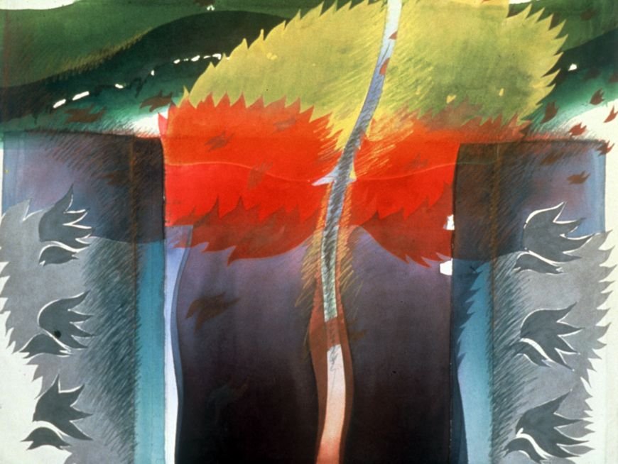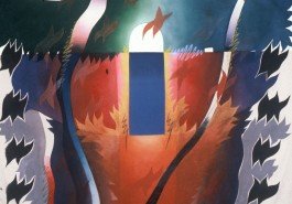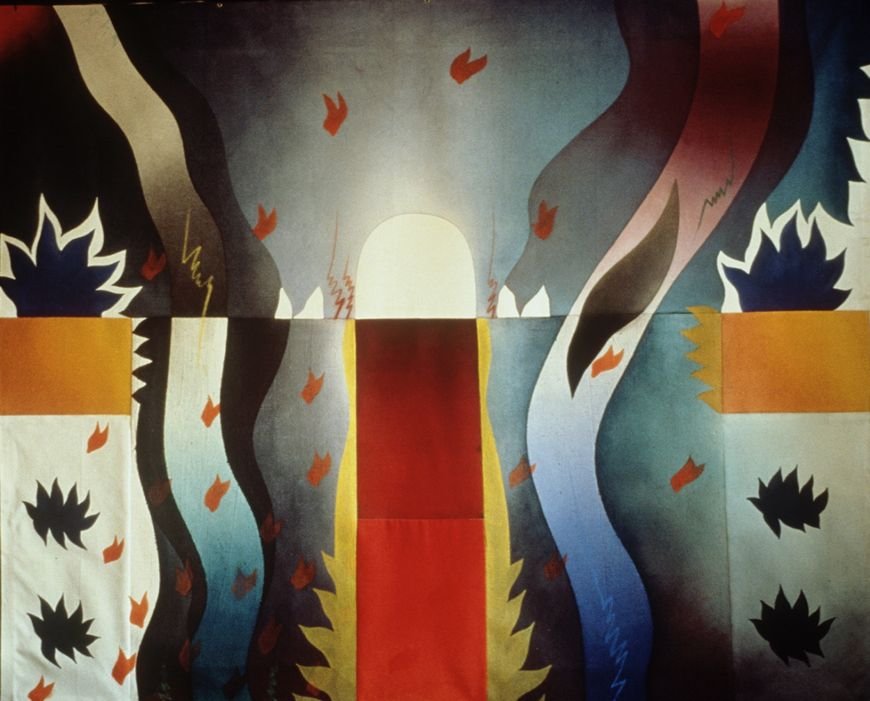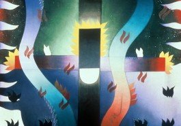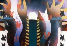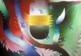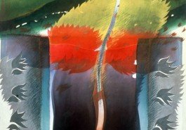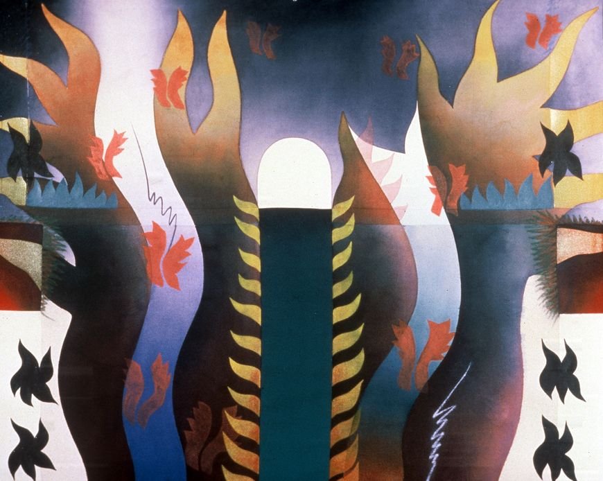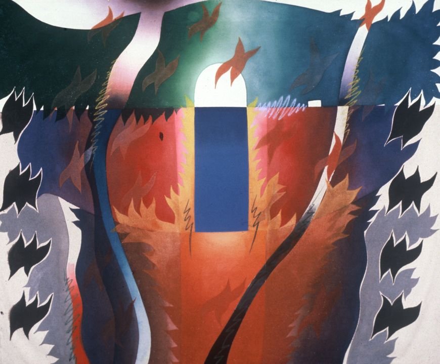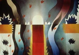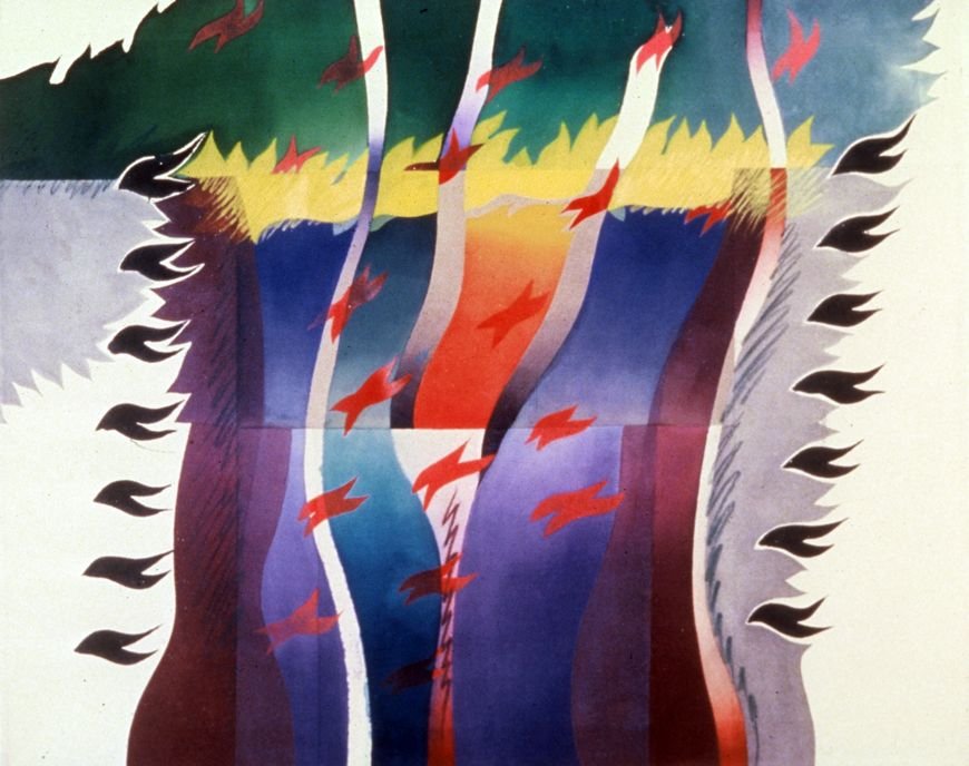Foot Prince / The Path, 56″ x 68″, 1981The Foot Prince Series: These are the first of three series painted on stretched canvas, then taken off the stretchers and hemmed into tapestries. The title “Foot Prince” evokes the vision of a royal prince, having lost his horse, searching to find his way on foot ~ through and out of the forest. His adventures can be imagined by contemplating the titles of some of the various paintings in the Foot Prince Series: The Force, The Path, The Day, The Night, and The Black.