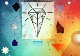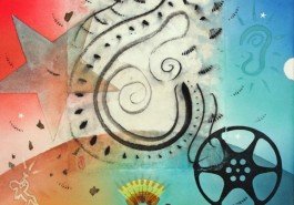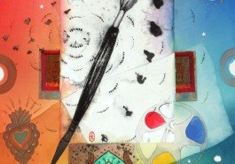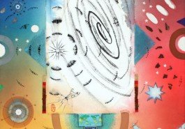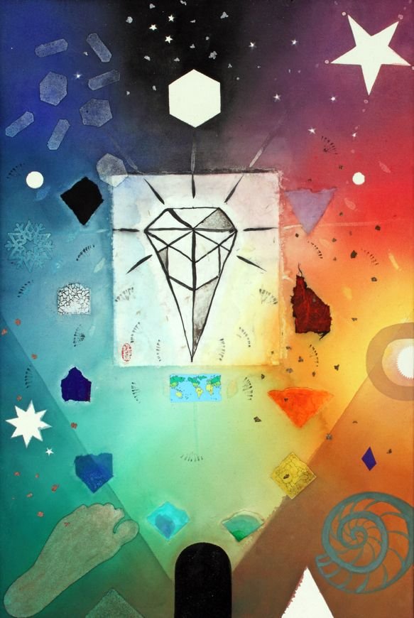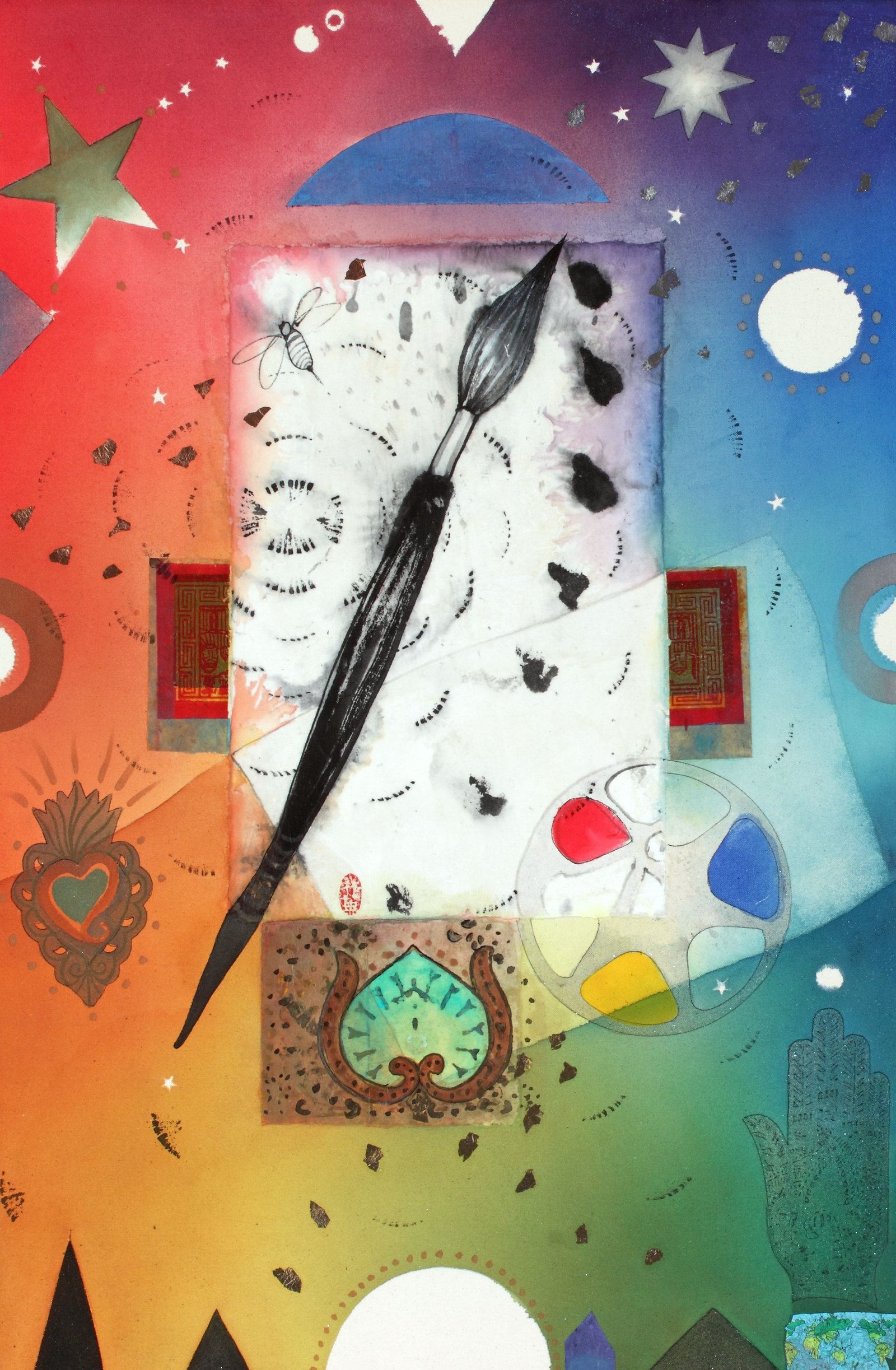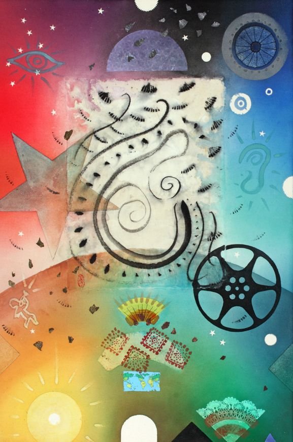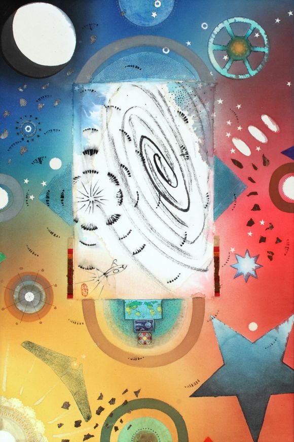 Medium: Acrylic, inks, found papers, metallic leaf, on unprimed canvas.