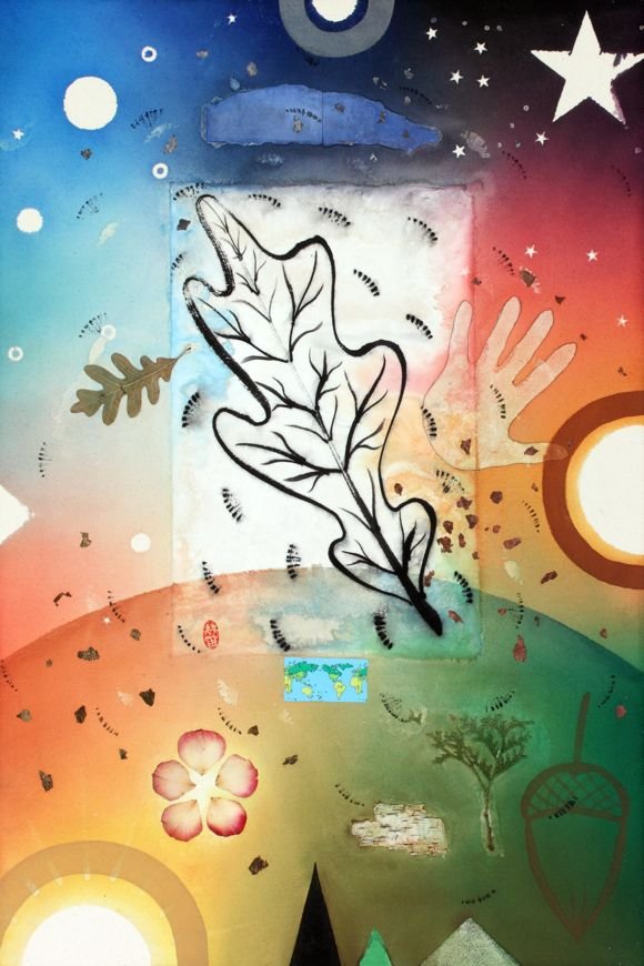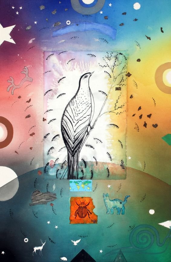 Fauna Kingdom, 36″ x 24″, 2013These six Paintings commemorate the inspiration, substance, process and nourishment of the artist and her life. Each has collaged within it a tiny map of The World. Hence they are called “Worlds of Inspiration”.